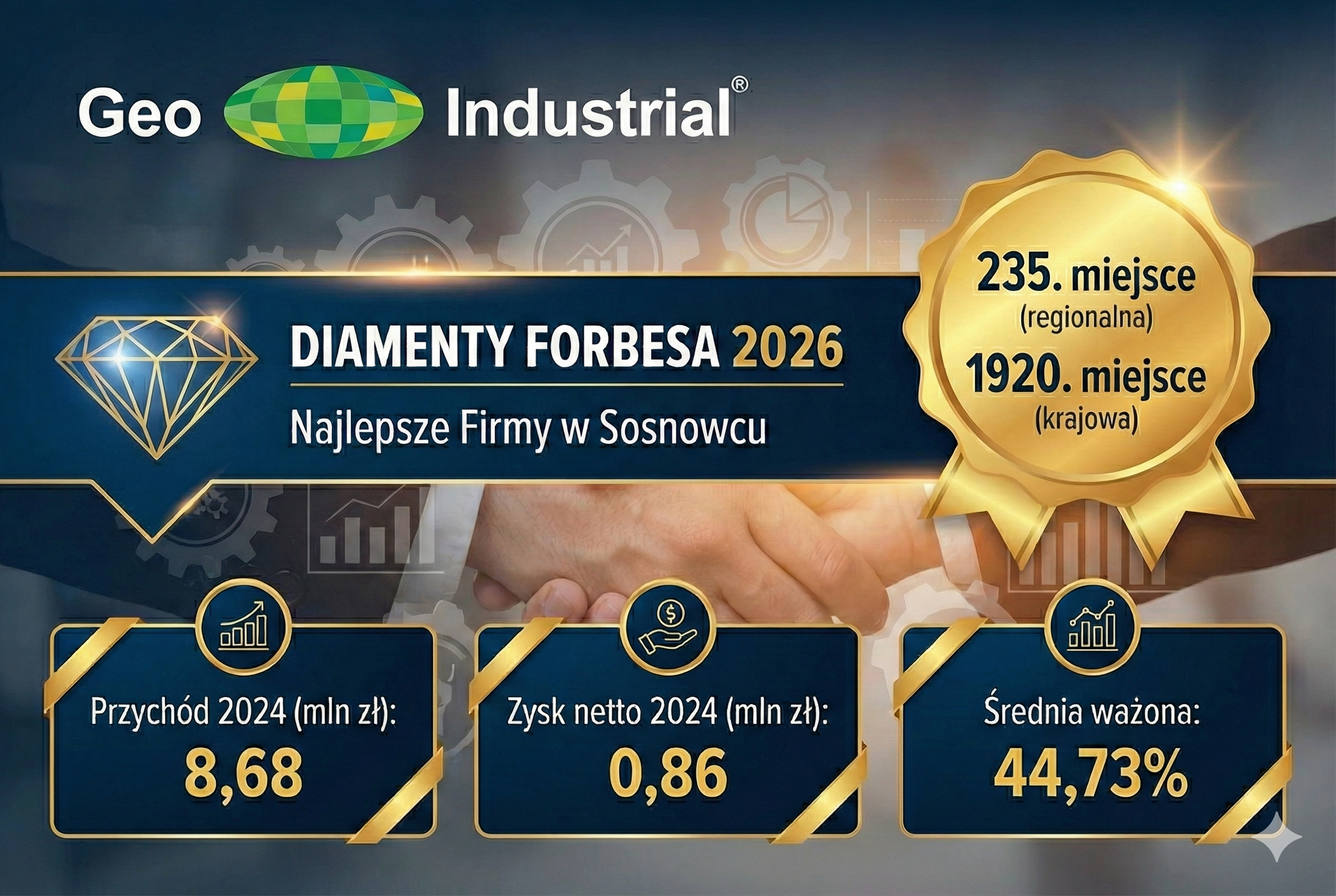 Z ogromną satysfakcją informujemy, że nasza firma znalazła się w prestiżowym rankingu „Diamenty Forbesa 2026”. To wyróżnienie potwierdza, że Geo-Industrial jest jednym z najdynamiczniej rozwijających się przedsiębiorstw w Polsce, a nasze usługi inżynieryjne zyskują coraz większe uznanie na rynku.